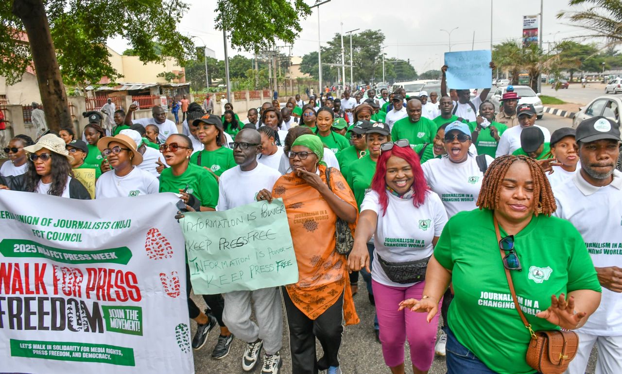 A ci gaba da bikin makon ‘yan jarida na shekarar 2025. Yan jarida ƙarƙashin inuwar Ƙungiyar Ƴan Jarida ta Najeriya (NUJ), reshen Babban Birnin Tarayya (FCT), sun gudanar da tattaki na lumana domin goyon bayan ‘yancin faɗar albarkacin baki, dimokuraɗiyya da kuma kare ƴancin ƙafofin yaɗa labarai a ƙasar.